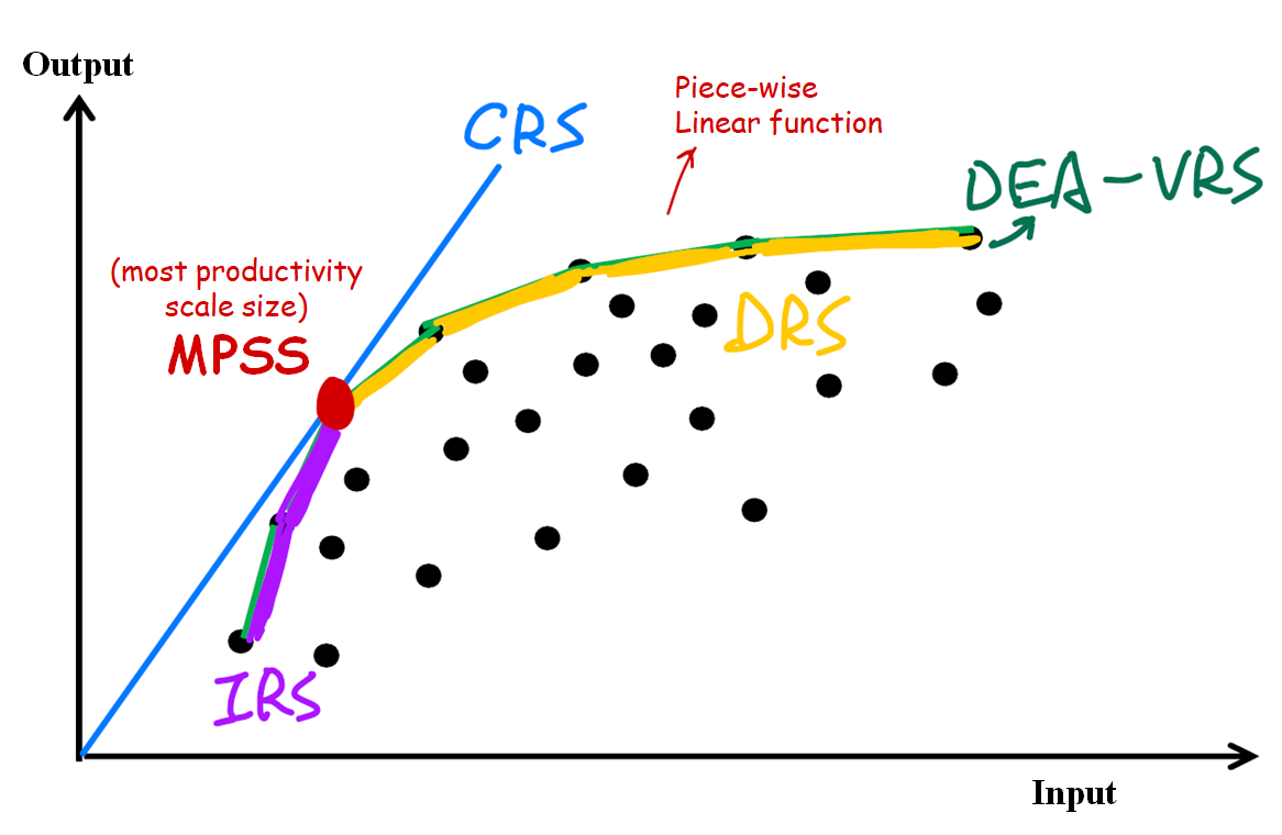 In practically, production usually is a system of Multi-Input Multi-Output(MIMO) which is almost impossible to formulate even guess the true production function because it has a high dimension of data. DEA is a nonparamic approach which have the benefit of not require to assuming a particular functional shape for the frontier, however it estimating approximately production function with existing data.[2].