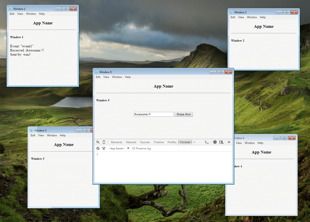 - You can, very easily, connect all of the created windows through events; you can trigger an event in window 1 and listen for it in window 2 and 3 and vice versa. This will help you make your application parts more connected and live. More details
