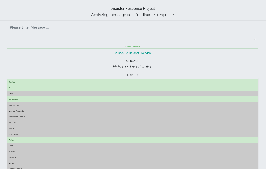 | Landing Page with first Plotly Visualisation | Second Graph Visualisation on Landing Page | Zoom into Second Graph Visualisation | Classification of Example Message "Help me. I need water." |