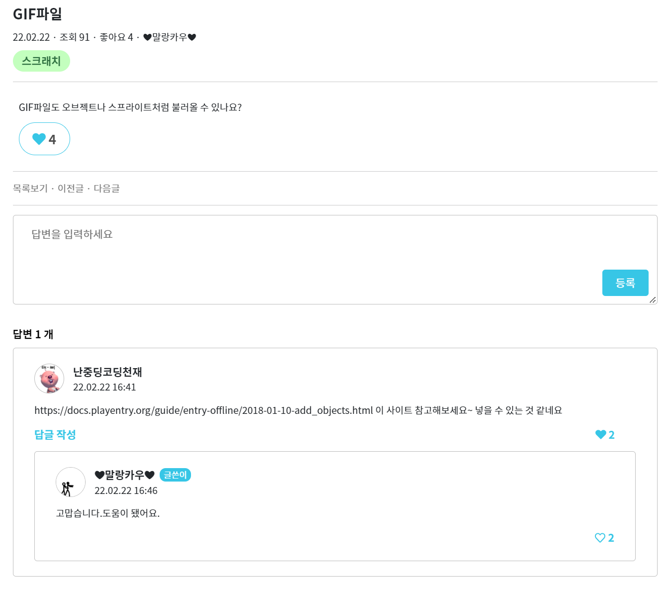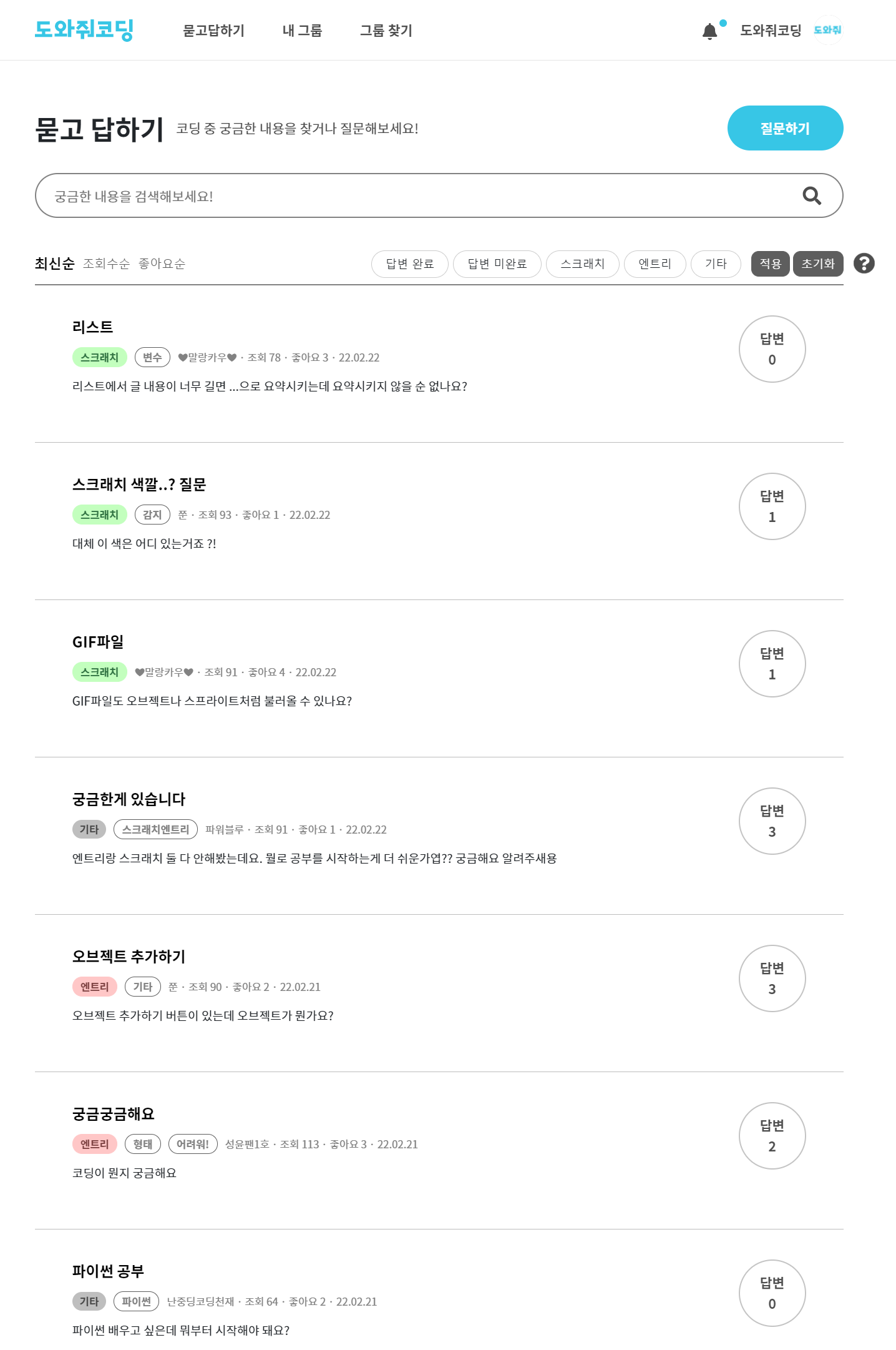 - 질문 정렬, 필터 기능 - (최신순, 조회수순, 좋아요순), (답변완료/미완료, 스크래치/엔트리/기타)