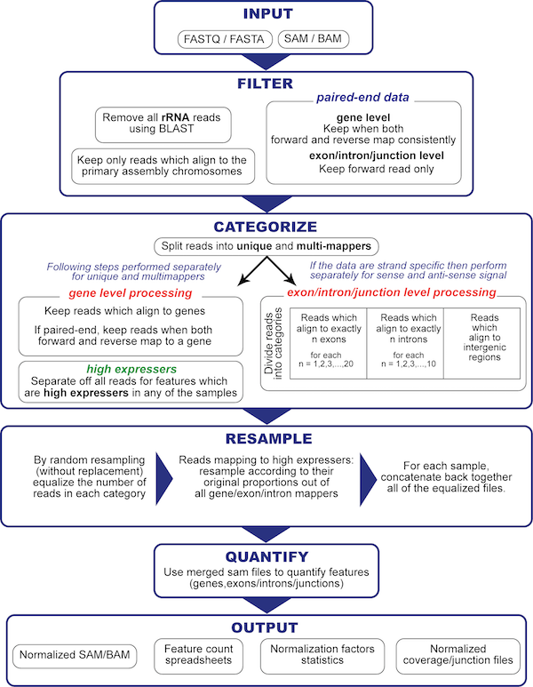 PORT offers two types of normalization: GENE and EXON-INTRON-JUNCTION level normalization. It uses resampling to equalize different categories of reads across all samples independently and then merges them together into a final set of reads.