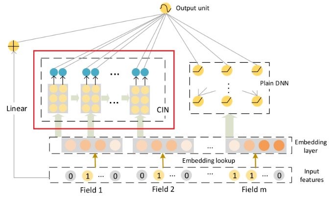 xDeepFM是2018年中科大联合微软在KDD上提出的一个模型,这个模型的改进出发点依然是如何更好的学习特征之间的高阶交互作用,从而挖掘更多的交互信息。而基于这样的动机,作者提出了又一个更powerful的网络来完成特征间的高阶显性交互,这个网络叫做 这个网络叫做CIN(Compressed Interaction Network),这个网络也是xDeepFM的亮点或者核心创新点了。xDeepFM的模型架构依然是w&D结构,更好的理解方式就是用这个CIN网络代替了DCN里面的Cross Network, 这样使得该网络同时能够显性和隐性的学习特征的高阶交互(显性由CIN完成,隐性由DNN完成)。模型结构如下: