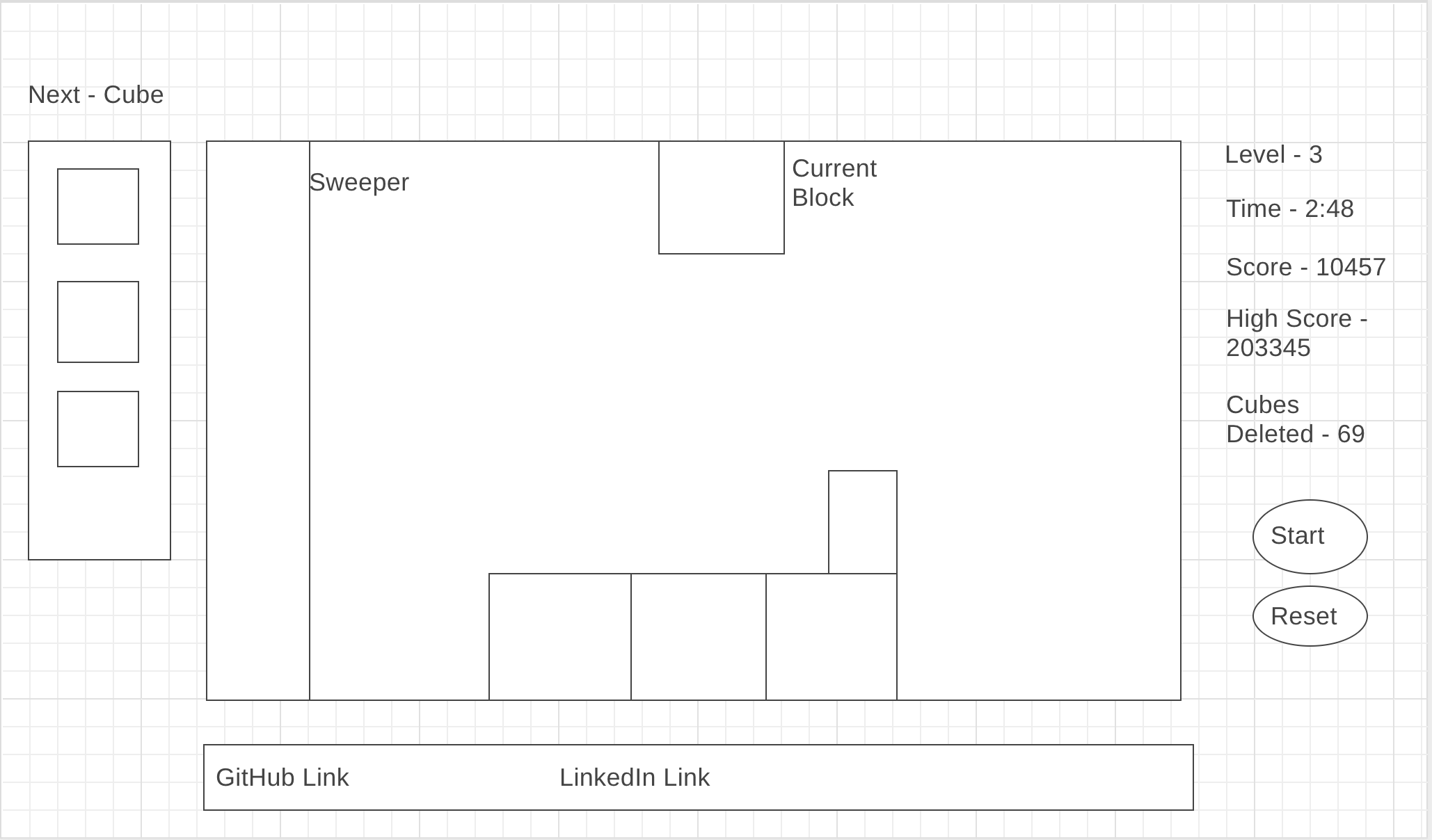The app will consist of a single page that will render the game board in the center while tracking the player's current level, current score, and the most recent high score on the right. The left side of the game board will consist of a place for the following pieces that will render to appear for the player to use. The bottom of the game board will consist of a Github link and a LinkedIn link.