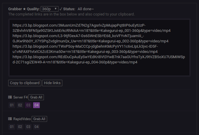 Grabber allows you to fetch episode links from 9anime. It currently support grabbing videos from 9anime Server (ex: Server F4) and RapidVideo. You can then couple these links with a download manager to download episodes in bulk.