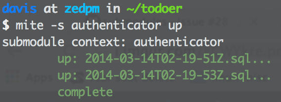 thats it. submodules inherit all settings from the .mite config of your main project. submodules need migrations + a .mite file, but it can be empty, or include dependency + ignorePaths values. the other mite commands work on submodules too.