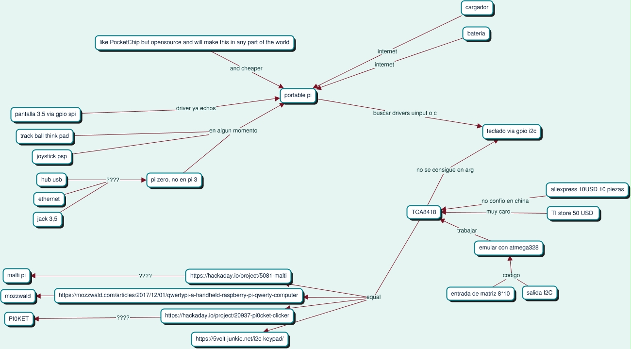 todo comenzo cuando queria comprarme la Pocket Chip (https://imgur.com/l437LvK 65 USD +-, es una computadora portable basada en ARM), como vivo en argentina comprarla me iba a salir alrededor de 6000 ars o 150 USD por lo que preferi intentar construirme una parecida basada en la conocida raspberry Pi , no estoy seguro si en la Pi3 o Pi Zero por un tema de ergonomia en la mano y consumo energetico.