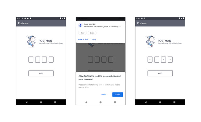Postman is a reactive One-tap SMS verification library. This library allows the usage of RxJava with The SMS User Consent API
