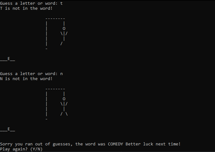 Hangman Simple hangman game using Python Instructions Download the two files and run the game through the terminal. Enter a character or a word and attempt to solve the word puzzle. Enjoy!