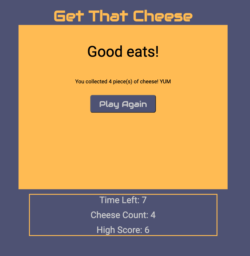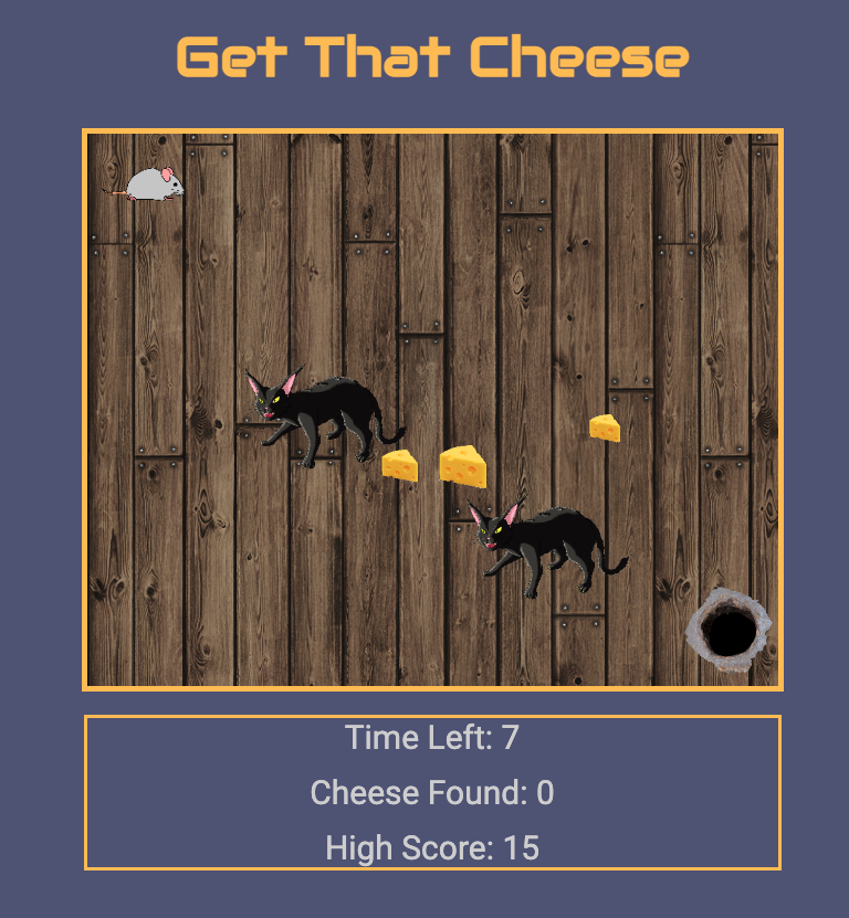 It's night and the humans have gone to bed. You're a mouse and you're hungry for cheese crumbles, which the messy homeowners have all over their floor. Go get it! Only problem is...the cats...and there's two of them trying get you before you get that cheese. You only have so much time to gobble all the cheese you can get your hands on so get busy.