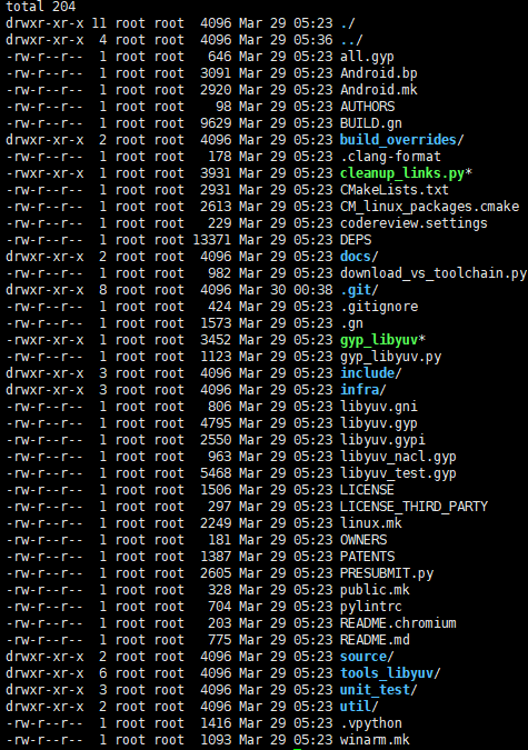 * 目前的libyuv[2018.03.30]的目录结构是这样的:  * 并没有`Application.mk`文件,自己配置的话也编译失败,楼主是否可以因应代码的变化,给出一套新的源码下的编译方法