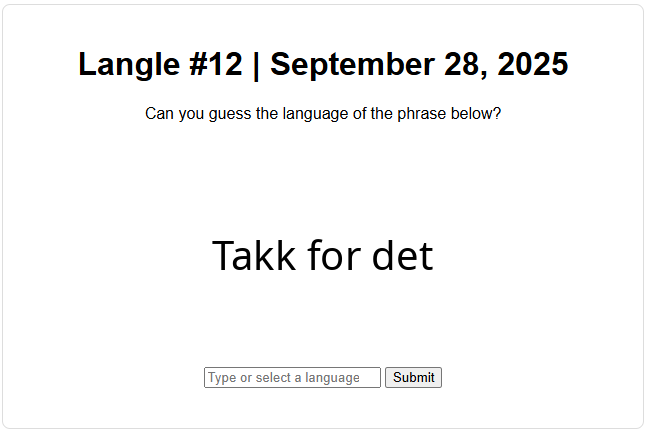Langle is a simple web-based puzzle game where a new phrase is presented each day. Your challenge is to correctly identify the language it's written in. Test your linguistic knowledge and pattern recognition skills every day!