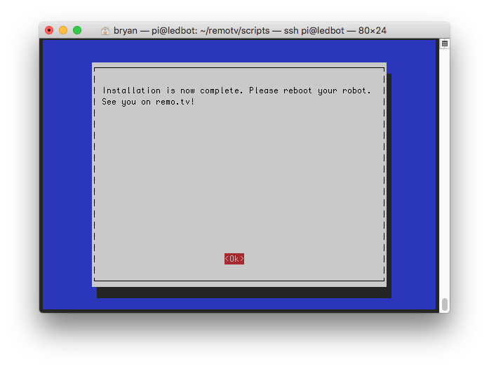 Installation is now complete. It's safe to reboot your robot; or you can run it manually by running