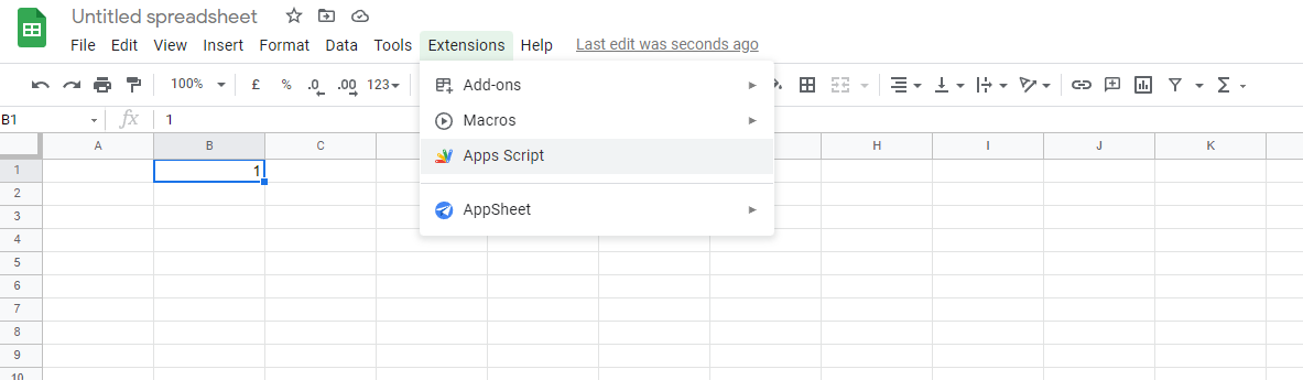 Afterwards, go to Extensions -> Apps Script. It will open a new tab containing an empty script.