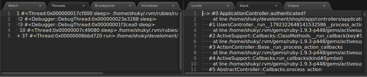 I cannot test this against all ruby versions, so I only explicity support Ruby 1.9.3 and Ruby 2.0.0. RVM is a good way to have multiple ruby versions installed at once and switch between them when debugging or running normally. Sublime Debugger will use the ruby version that you set as default, so you must set either Ruby 1.9.3 or Ruby 2.0.0 as the default. Remember to reinstall the byebug or debugger gem when you change ruby versions, or else you will get an Connection could not be made: [Errno ##] Connection refused error.