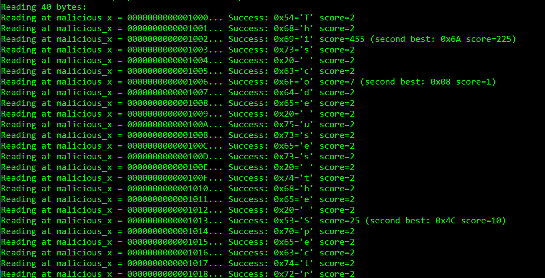 Spectre-Demo A simple demo of the Spectre vulnerability written in C. Specs of my host: CPU: Intel(R) Core(TM) m3-6Y30 CPU @ 0.90GHz 1.51GHz RAM: 8 GB (Usable 7.87GB) Screenshot
