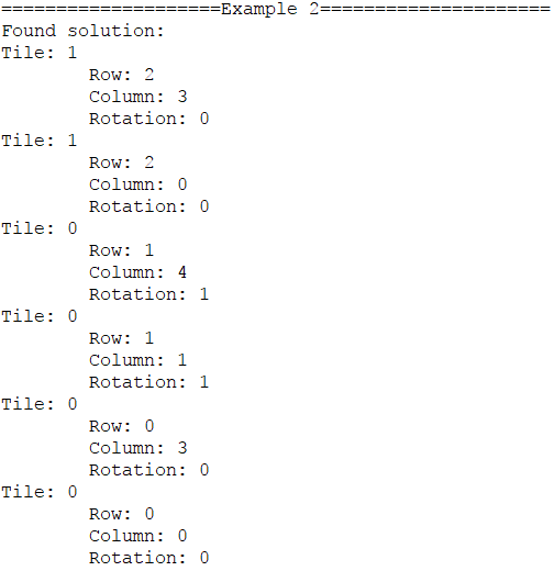 print("No solution found")To use custom tiles, you can simply extend the tile class, and override the tile property with the definition list, and override the uniqueRotations with the number of rotations that produce unique shapes. The example is shown below.