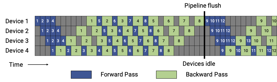 - Aaron Harlap and Deepak Narayanan and Amar Phanishayee and Vivek Seshadri and Nikhil R. Devanur and Gregory R. Ganger and Phillip B. Gibbons (2018). PipeDream: Fast and Efficient Pipeline Parallel DNN Training. CoRR, abs/1806.03377. *Yanping Huang and Yonglong Cheng and Dehao Chen and HyoukJoong Lee and Jiquan Ngiam and Quoc V. Le and Zhifeng Chen (2018). GPipe: Efficient Training of Giant Neural Networks using Pipeline Parallelism. CoRR, abs/1811.06965.