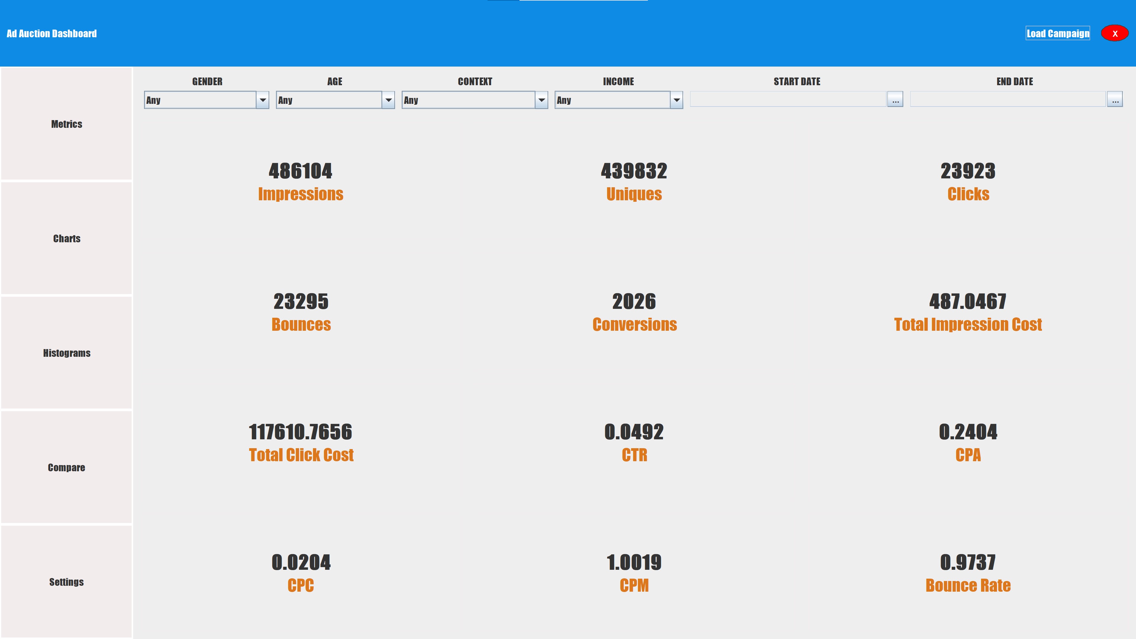 An Ad Auction Dashboard created as part of a 6 person group project. Displays large amounts of data and generates metrics, charts and more.