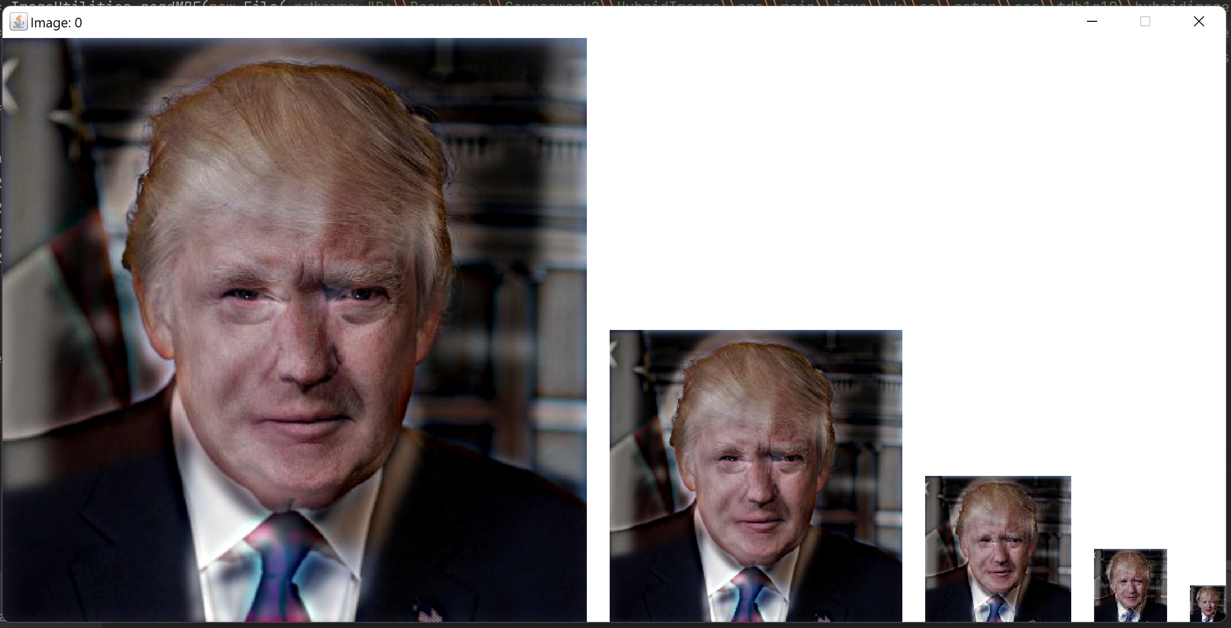 A program that convolutes two images using a low pass and a high pass filter and creates a hybrid image. The below example shows an image of Trump and Boris Johnson and a demonstration of the effect the image creates.