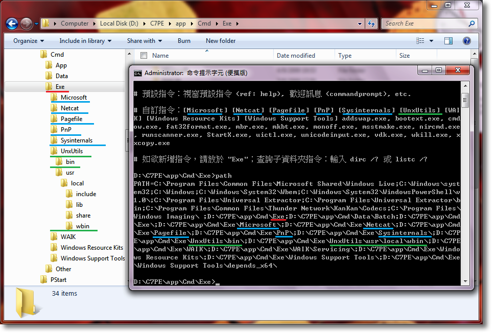 The following illustrates the relationship between folders and PATH. Note the green line especially, while there are many folders inside UnxUtils, only [bin] and [wbin] are appended to PATH. That's because only those 2 folders contain executables.
