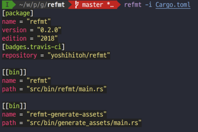refmt is a data format translation tool written in Rust. Currently only JSON, YAML and TOML are available.